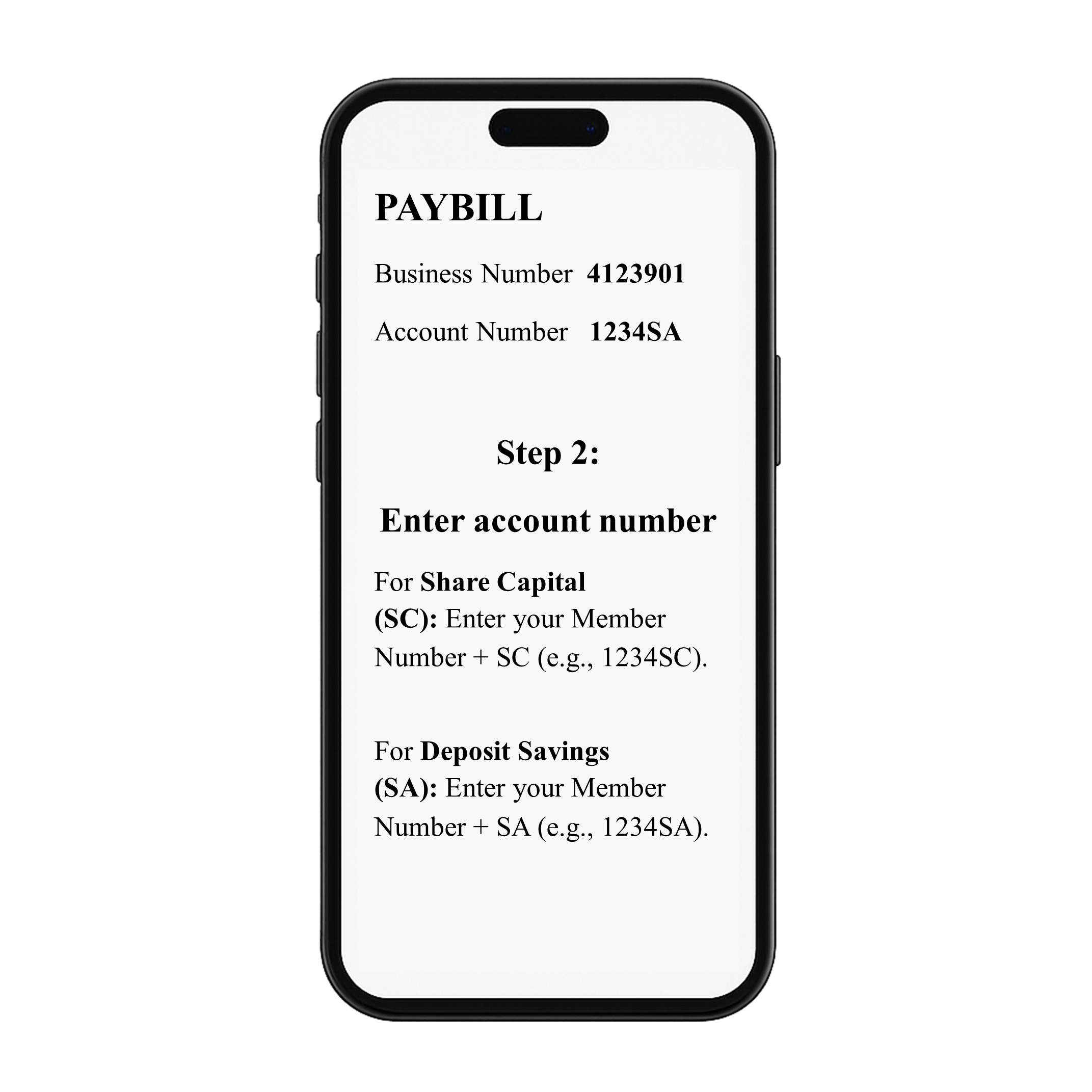 For Deposit Savings (SA): Enter your Member Number + SA (e.g., 1234SA).