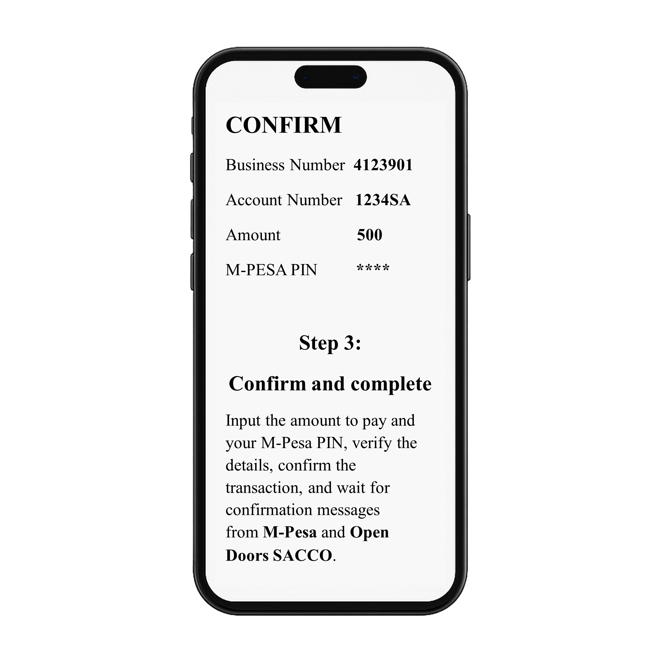 Input the amount to pay and your M-Pesa PIN, verify the details, confirm the transaction, and wait for confirmation messages from M-Pesa and Open Doors SACCO.